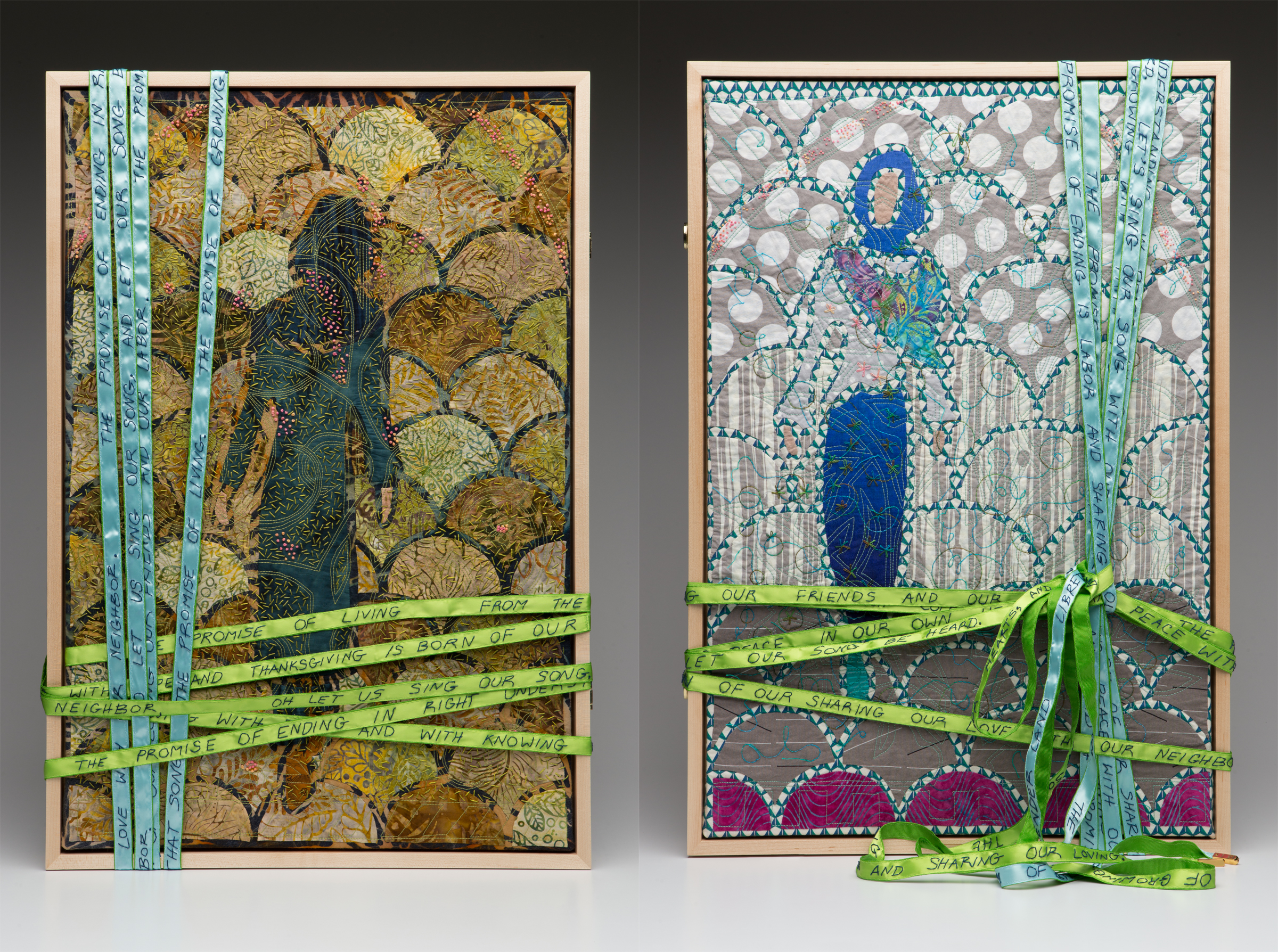 2018/27”x18” each/hinged back-to-back, hand-appliquéd, hand-embroidered, machine quilted/photo by Aaron Paden