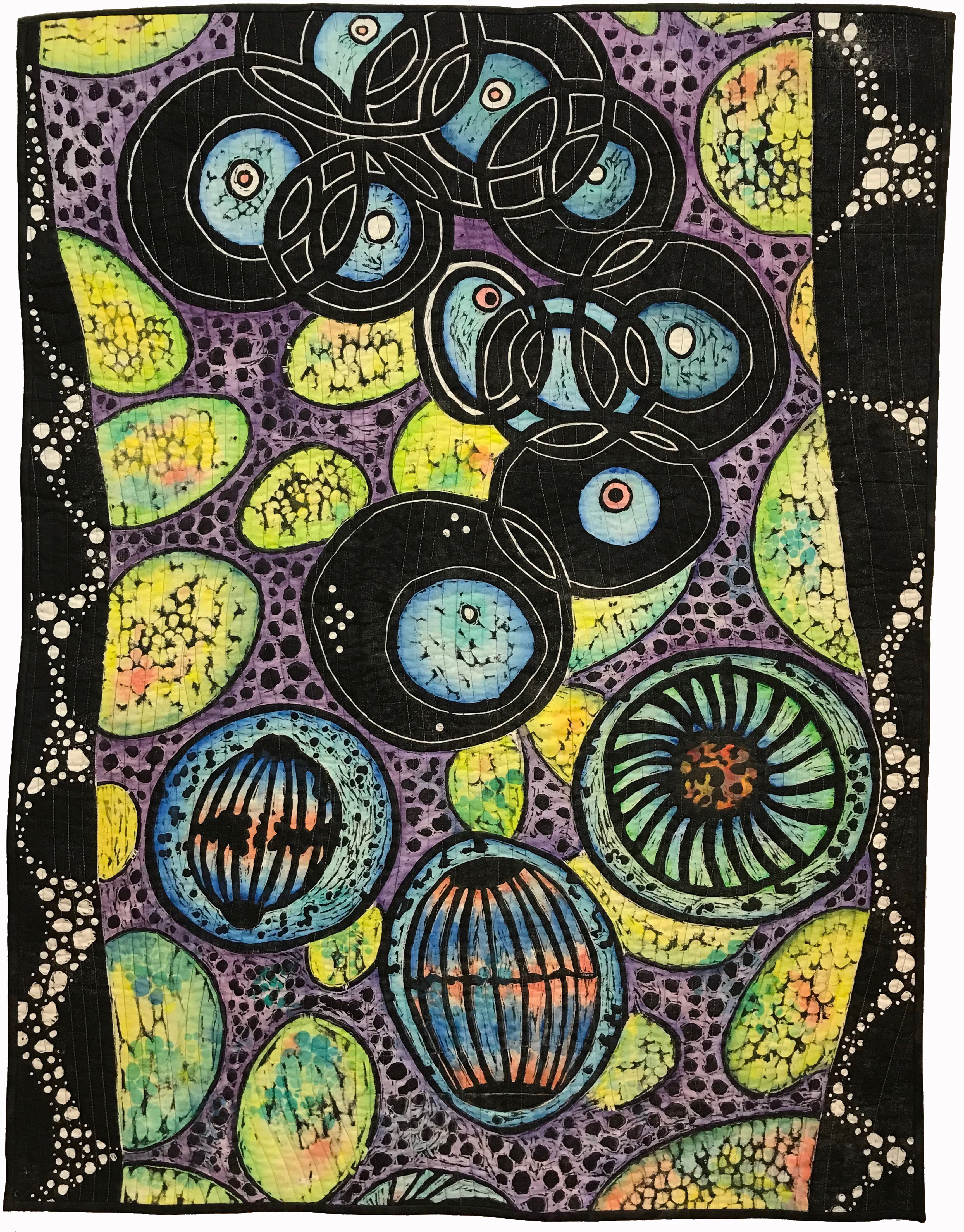 2018/40″x30″/wood cut print on muslin/painted with Inktense blocks/machine quilted/photo by Kathy Suprenant