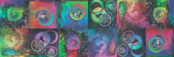 These quilts began as abstract sun paintings with found objects as “stencils”. Images were manipulated and combined to produce a single digital image that was printed onto a fabric panel. The result is a whole cloth quilt constructed from digital textile prints that is machine- and hand-stitched. Many of these quilts look like something growing on a Petri dish or perhaps distant, imaginary planets.