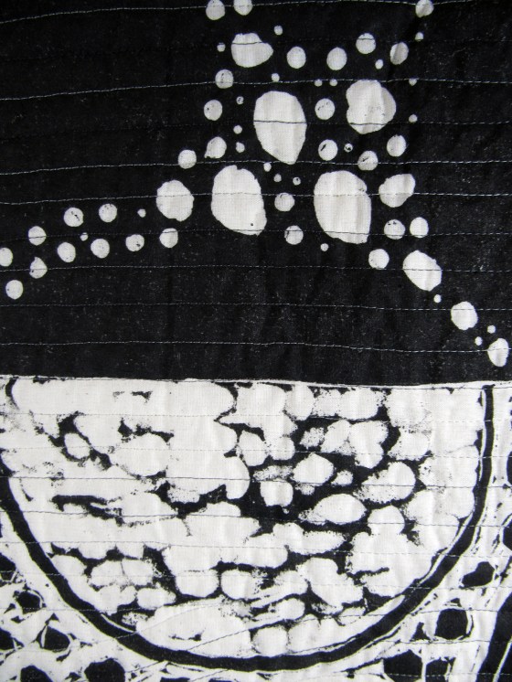 Cell-ebration was created during a public steamroller-printing event held at the Lawrence Art Center on May 27, 2017. The whole cloth quilt began as a colossal woodcut that I hand-carved over an eight-week period. My design was inspired by the drawings of Eduard Van Beneden, a 19th century Belgian scientist who carried out pioneering studies of cell division (Recherches sur les Dicyemides, 1876).