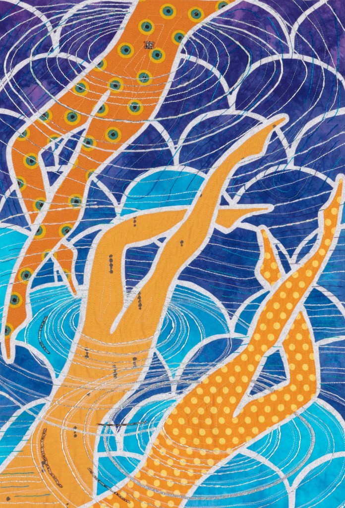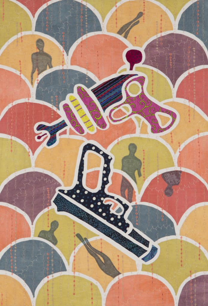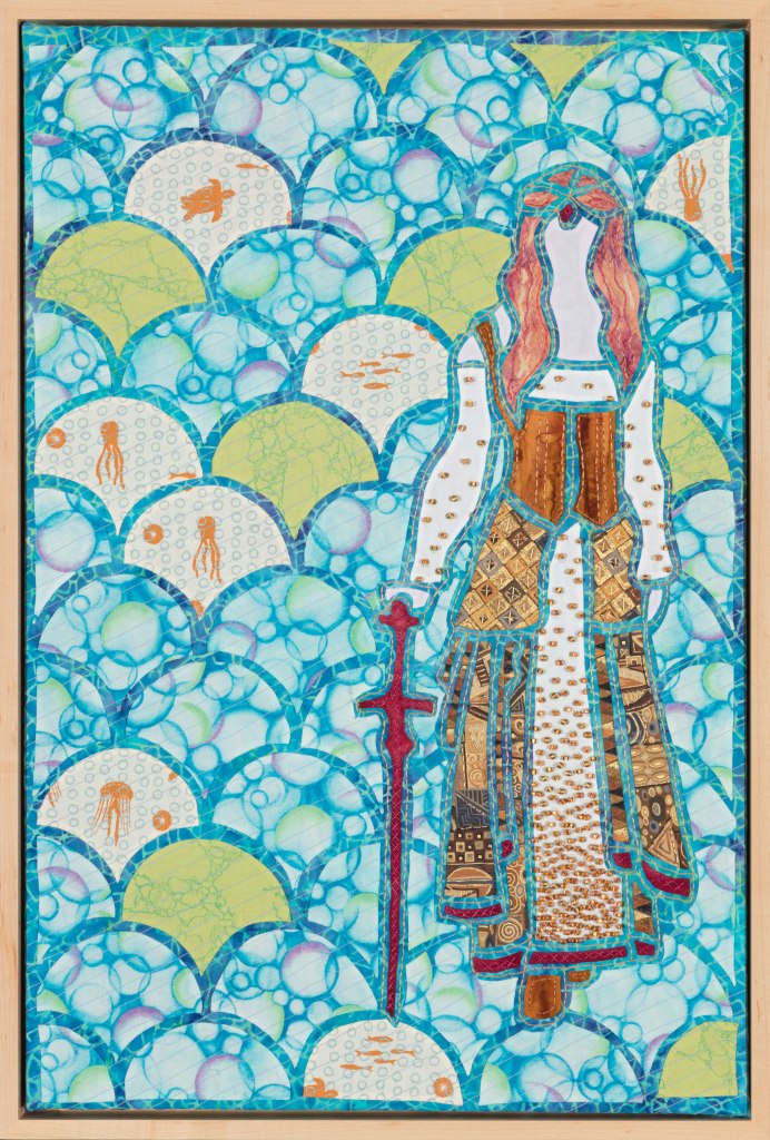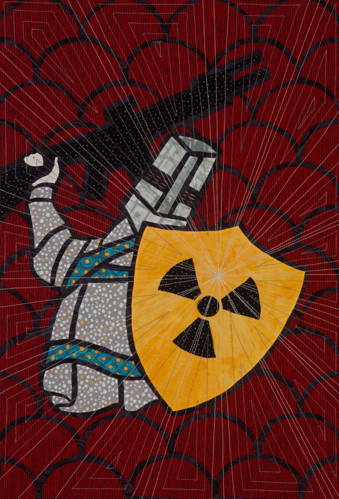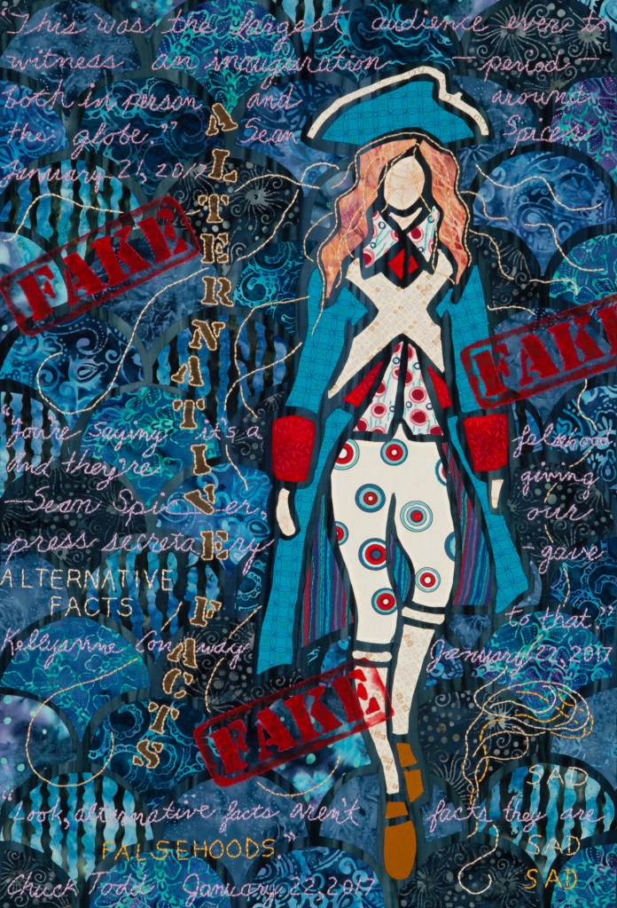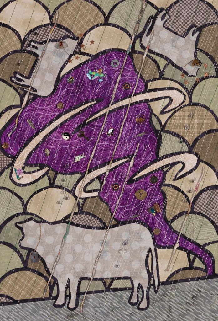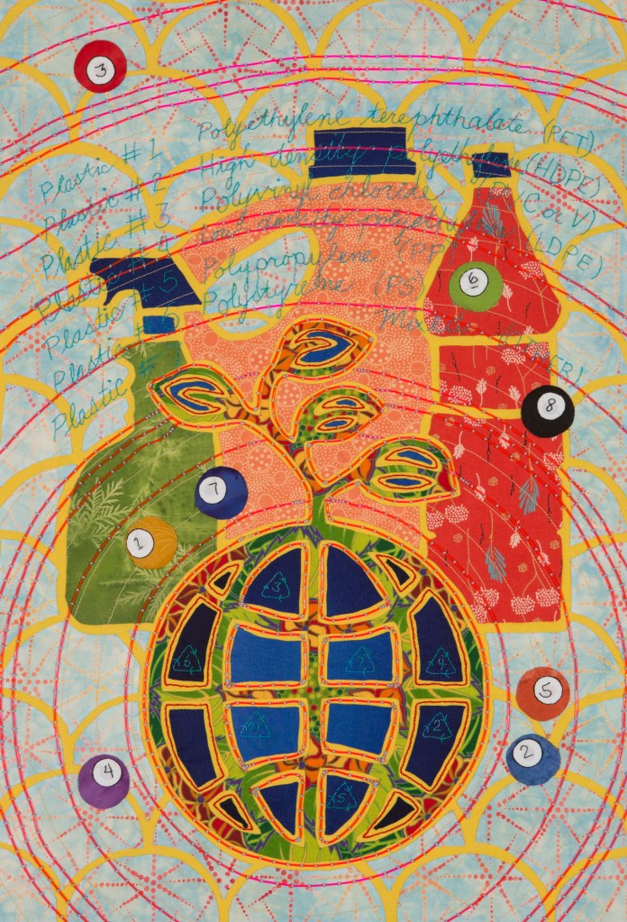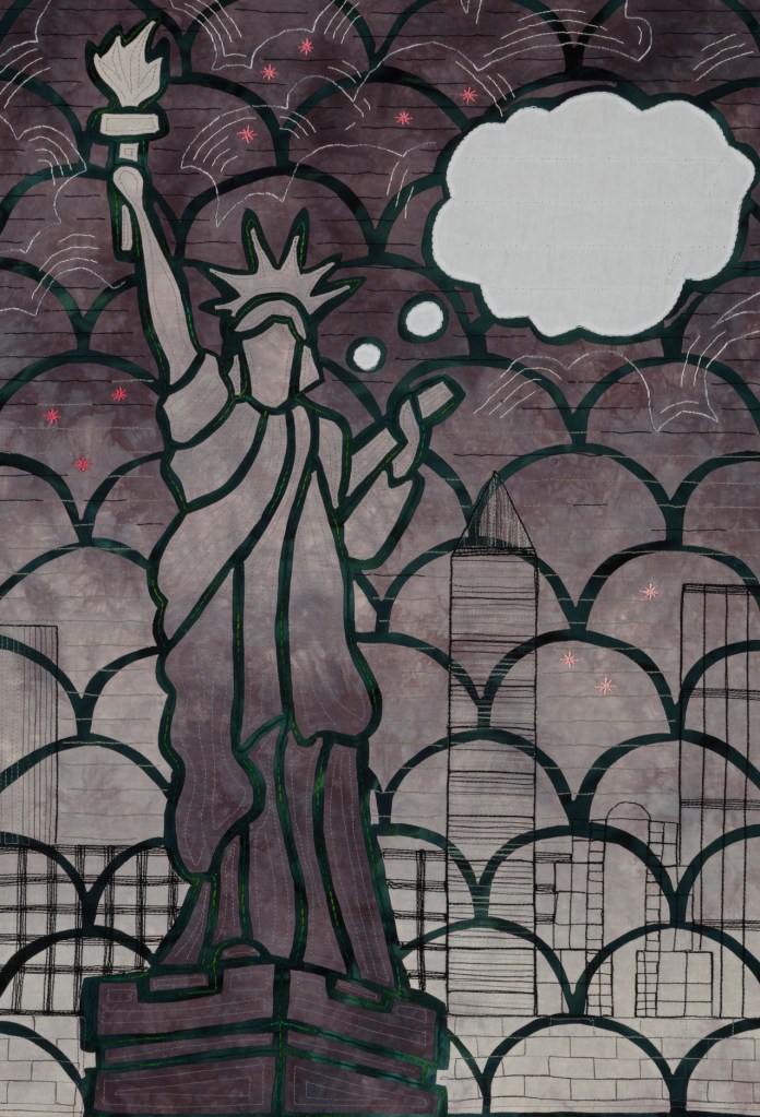 I wondered what Ming missed during those 507 years so Ming became my artistic muse. Initially, my intent was to address playful topics and translate my ideas in bright colors in my naïve art style. Many of the quilts are colorful, whimsical and idiomatic. However, much of the artwork is serious, topical and wrapped in social commentary.