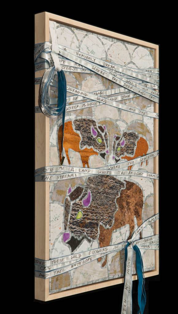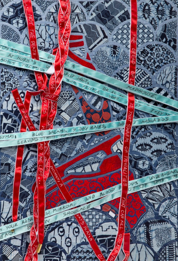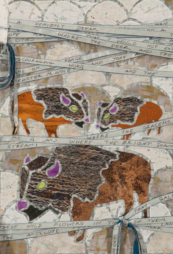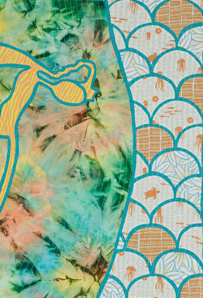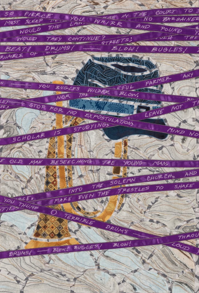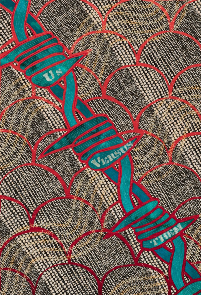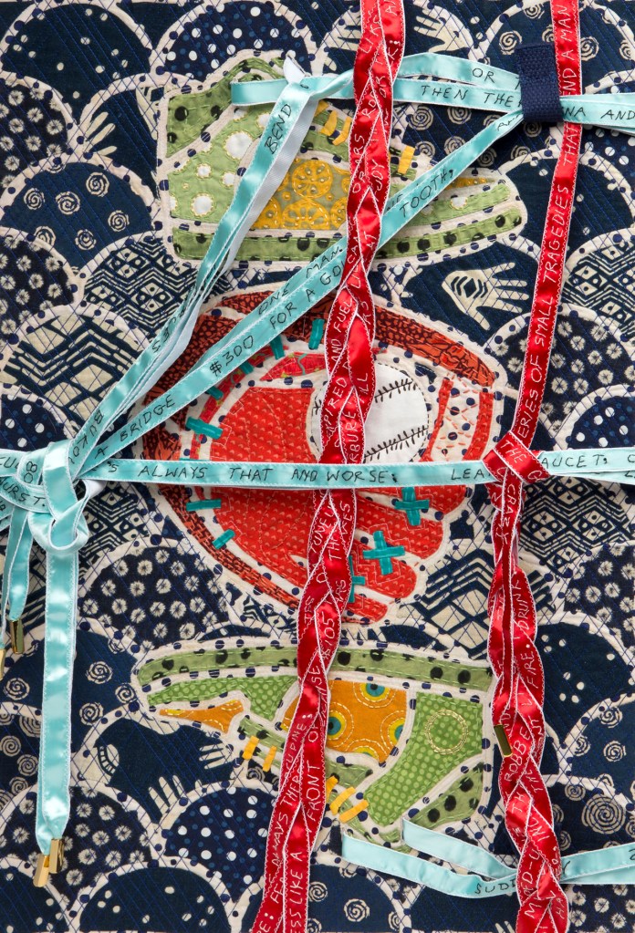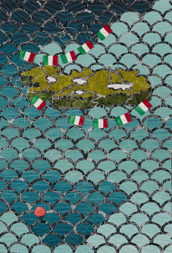 I wondered what Ming missed during those 507 years so Ming became my artistic muse. Initially, my intent was to address playful topics and translate my ideas in bright colors in my naïve art style. Many of the quilts are colorful, whimsical and idiomatic. However, much of the artwork is serious, topical and wrapped in social commentary.